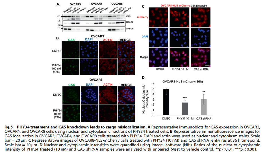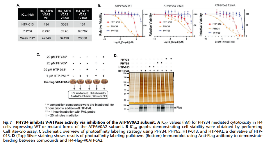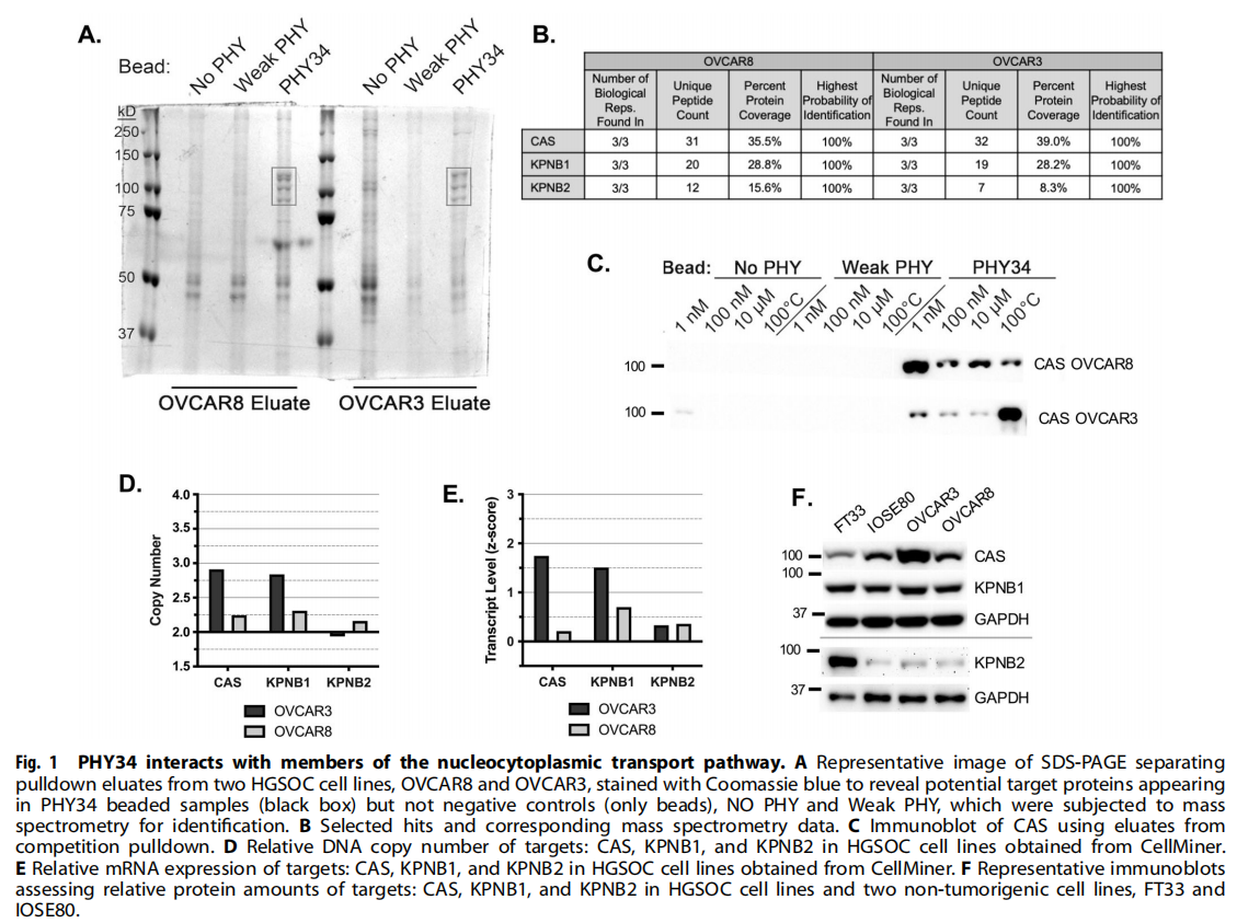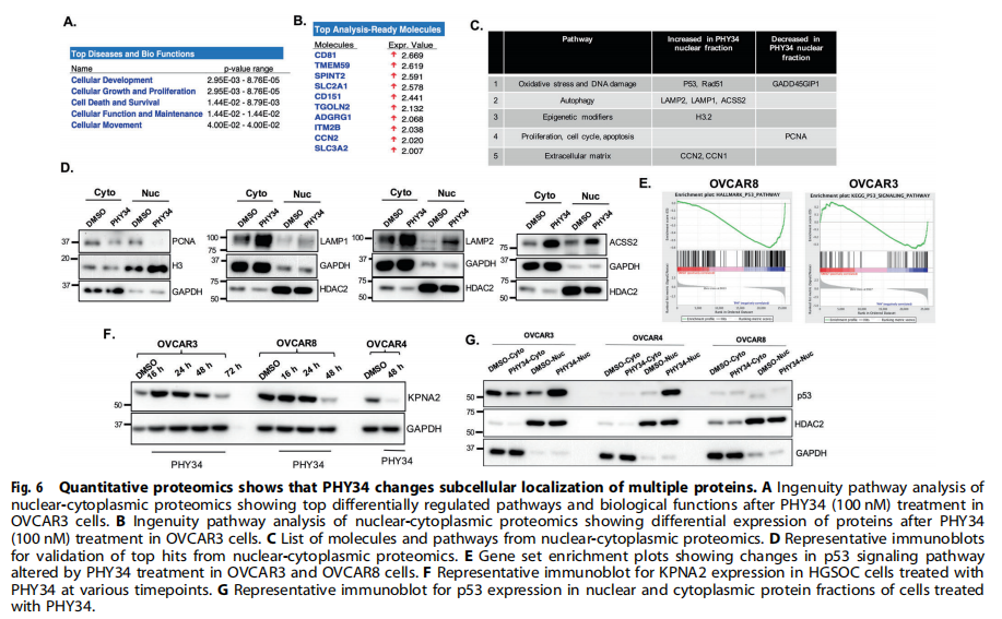 本研究结果显示,PHY34与核质转运途径的成员相互作用(见图一);患者样本分析证明CAS是一种很有前途的药物靶点(见图二);PHY34具有与已知核质转运抑制剂不同的作用机制(见图三)。CAS过表达减少PHY34诱导的细胞死亡,CAS敲低改变了HGSOC细胞中对PHY34的反应(见图四)。PHY34处理和CAS敲低导致货物定位错误(见图五);定量蛋白质组学表明PHY34改变了多种蛋白质的亚细胞定位(见图六);PHY34通过抑制ATP6V0A2亚基来抑制V-ATPase活性(见图七)。