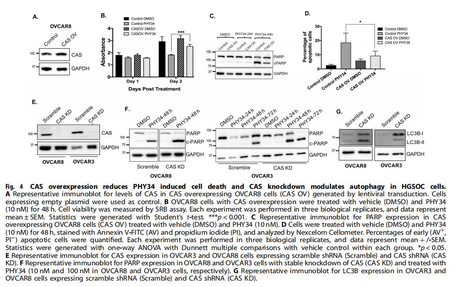 总之,从临床样本分析中获得的证据表明CAS是一个非常有前途的药物靶点。PHY34是一种能够结合CAS的小分子抑制剂,其抑制作用会改变核输入和细胞周期,这对非致瘤细胞具有特异性。本研究的数据表明,PHY34是一种很有前途的癌症治疗小分子,它靶向ATP6V0A2亚基,诱导自噬抑制,同时与CAS相互作用,改变蛋白的核定位。PHY34代表一种针对HGSOC的高效细胞毒性小分子,其功能是抑制V-ATPase和CAS活性,从而抑制自噬。