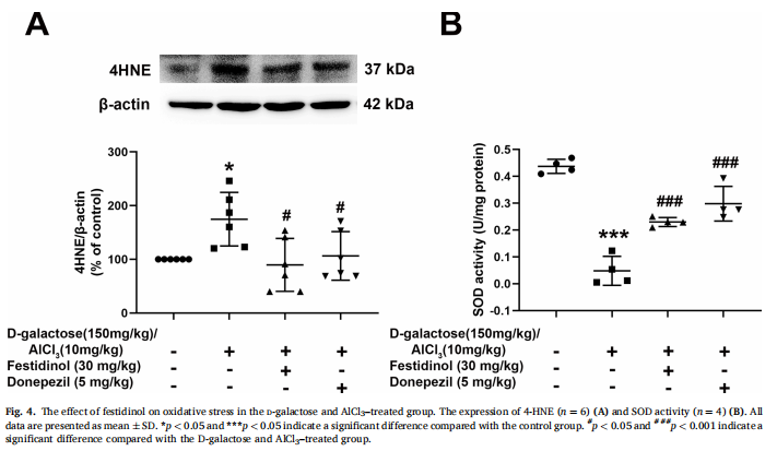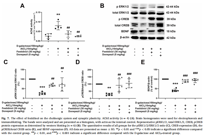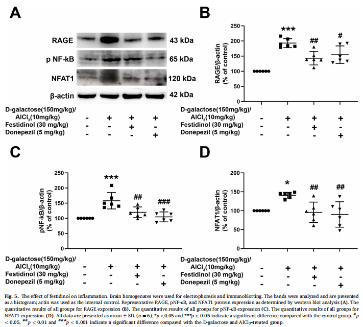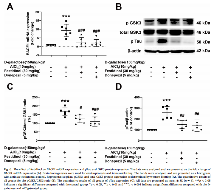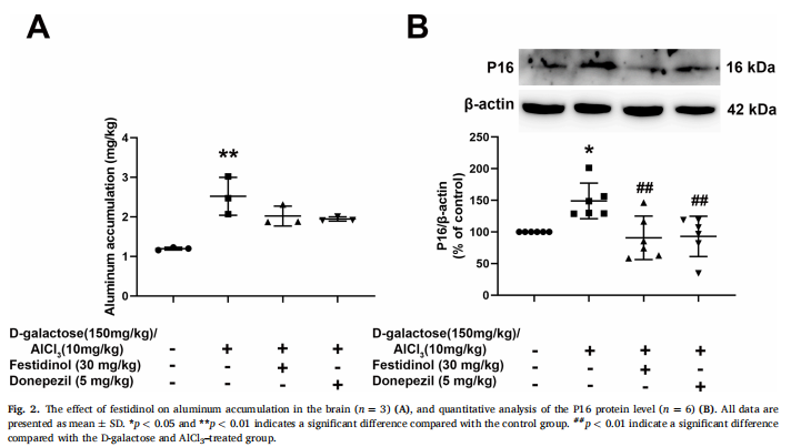 将D-半乳糖(150mg/kg)和氯化铝(10mg/kg)腹膜内注射到40只小鼠中,持续90天,以生成具有认知障碍的AD小鼠模型。然后口服Festidinol(30mg/kg)和多奈哌齐(5mg/kg)90天,然后测量大脑的行为和分子变化。实验结果显示:暴露于D-半乳糖和AlCl(分别为2.5±0.5mg/kg,对照组的149.1±28.1%)后,铝积累和细胞衰老标志物P16的表达增加(见图二)。Festidinol显着降低了逃生潜伏期(8.7±4.3s)并增加了Morris水迷宫测试中的平台穿越次数(8±1.4次)(见图三)。给予festidinol后超氧化物歧化酶活性显着升高(见图四),但4-羟基-2-壬烯醛、晚期糖基化终产物受体、活化B细胞(pNF)的磷酸化核因子kappa-轻链增强剂的水平显着降低-κB)和活化T细胞的核因子1(NFAT1)(见图五)。Festidinol减毒暴露于D-半乳糖和AlCl3通过减少β位点APP裂解酶1的mRNA产生β淀粉样蛋白(BACE1)(见图六)。Festidinol还显着降低pTau和磷酸化糖原合酶激酶3的表达(分别为对照的148.6±37.6%,对照的125.3±22.6%)(见图七、图八)。