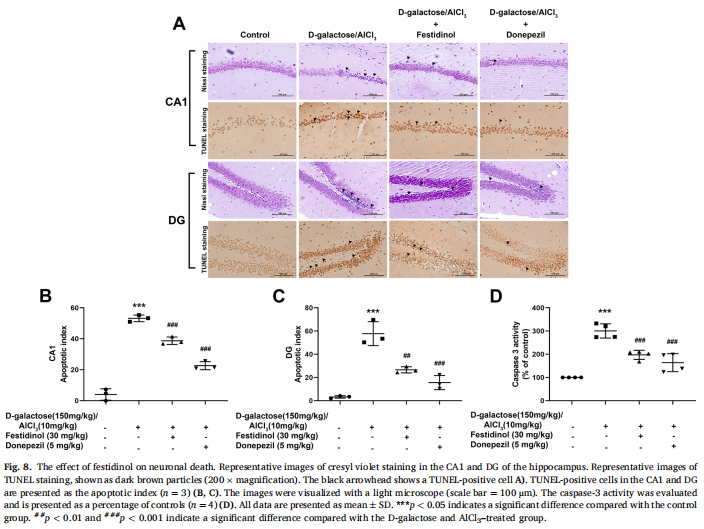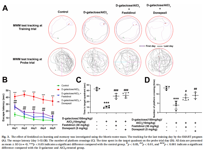 Festidinol是一种黄烷-3-醇,已被证明可以减少晚期糖基化终产物(AGEs)和活性氧物质,这两种物质在许多神经退行性疾病的病理学中都起着至关重要的作用。因此,我们旨在研究festidinol对D-半乳糖和AlCl3诱导的AD样病理的潜在保护作用。
