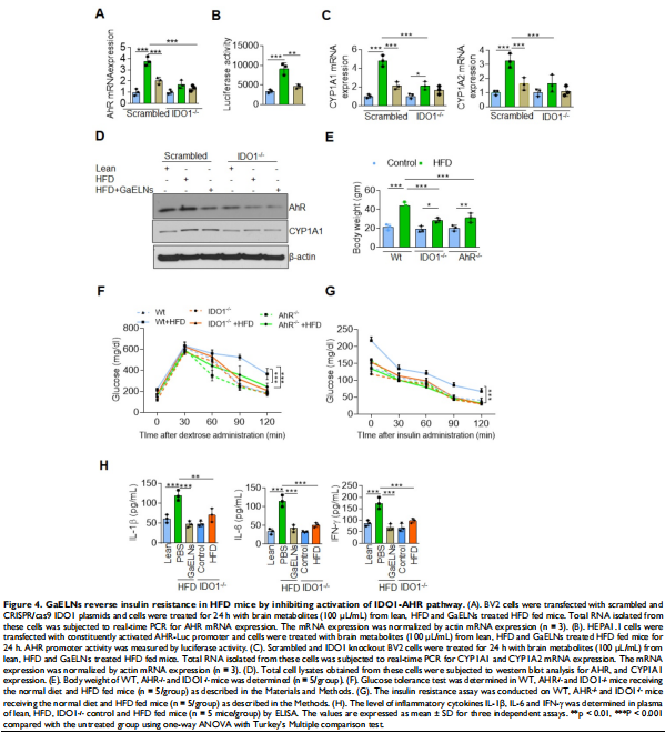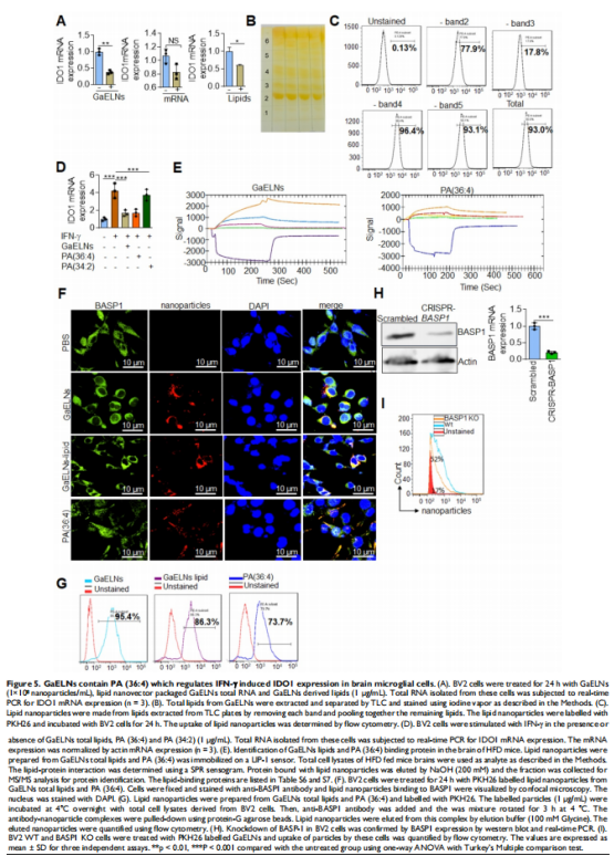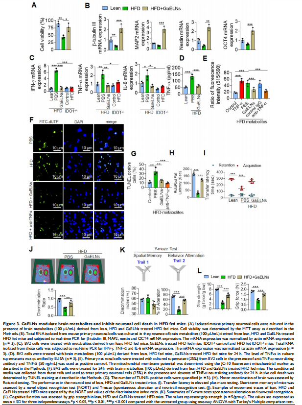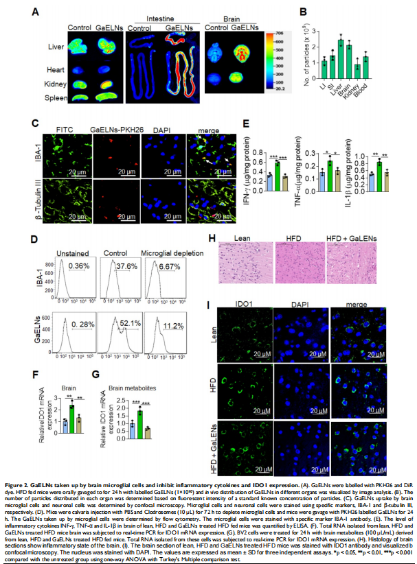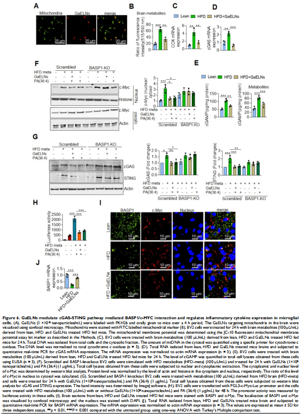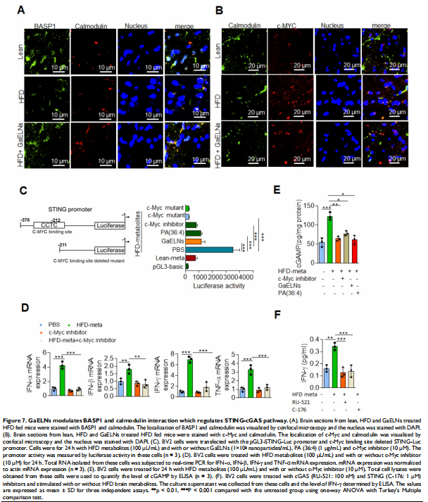 分离 GELNs 并将其口服给予 HFD 喂养的小鼠。GaELNs 被荧光标记,用于监测口服给药后的体内运输路线,并量化了几种组织中的粒子数量。通过ELISA和实时PCR测量炎性细胞因子来确定脑部炎症。使用 JC-10 荧光染料测定小胶质细胞的线粒体膜通透性。体内_通过 TUNEL 测定对凋亡细胞死亡进行量化。通过 LC-MS 分析鉴定和量化脑代谢物。小鼠的记忆功能是通过几种记忆功能分析来确定的。GaELNs对小鼠葡萄糖和胰岛素反应的影响通过葡萄糖和胰岛素耐量试验确定。c-Myc 定位和与 BASP1 和钙调蛋白的相互作用通过共聚焦显微镜确定。本文研究结果表明,GaELNs 优先摄取小胶质细胞并抑制 HFD 小鼠的脑部炎症(见图一)。GaELN 磷脂酸 (PA) (36:4) 是通过与小胶质细胞 BASP1 相互作用吸收 GaELN 所必需的。GaELNs/BASP1 复合物的形成是抑制 c-Myc 介导的 STING 表达所必需的。GaELN PA 与 BASP1 结合,通过与 c-Myc 转录因子竞争性结合 CaM 来抑制 c-Myc 的表达和活性(见图六、图七)。抑制 STING 活性会导致一系列炎性细胞因子的表达降低,包括 IFN-γ 和 TNF-α。IFN-γ 诱导 IDO1 的表达(见图二),这反过来又以 IDO1 依赖性方式产生的代谢物激活导致肥胖的 AHR 途径(见图五)。来自 GaELNs 处理的小胶质细胞的代谢物促进神经元分化并抑制线粒体介导的神经元细胞死亡(见图三)。GaELNs 治疗的 HFD 小鼠在这些小鼠中表现出改善的记忆功能和增加的葡萄糖耐量和胰岛素敏感性(见图四)。