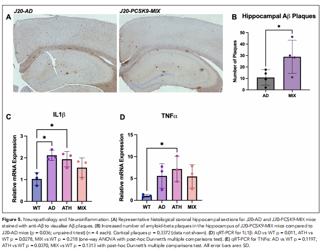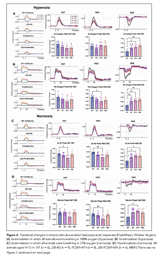本研究首次在一种新的动脉粥样硬化动物实验模型(PCSK9-ATH)中研究了神经血管功能,并首次在一个特征良好的AD模型中通过实验诱导了动脉粥样硬化的共病环境;J20-hAPP,创建混合合并症模型(J20-PCSK9-MIX)。将这些小鼠与年龄匹配的(9–12m)WTC57BL/6J对照和J20-AD小鼠进行比较。鉴于系统性动脉粥样硬化是痴呆的主要危险因素,支持动脉粥样硬化、神经血管衰退和痴呆之间关系的机制仍不清楚。