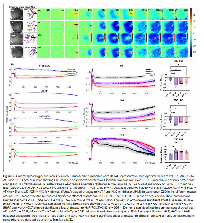 总之,作者报告了一种新的动脉粥样硬化实验模型(PCSK9-ATH)中神经血管功能受损的新发现,其特征是刺激诱发的血容量减少,而诱发的神经活动没有任何显着改变,显示出神经血管解偶联的证据。本文在轻度fAD模型(J20-AD)中诱导动脉粥样硬化,以创建混合共病模型(J20-PCSK9-ATH),其中报告海马Aβ斑块数量显着增加,但诱发的血流动力学没有任何显着变化或与WT或J20-AD小鼠相比的神经反应。这项研究的一个重要发现是CSD在患病动物中更为严重。这可能反映了大脑的整体炎症状态,也可以作为基线状态和评估治疗的有效临床前和人类临床生物标志物。未来的研究应包括通过单细胞群的全基因组转录组学方法评估其他炎症标志物和细胞通路变化。在更严重的fAD模型中诱导动脉粥样硬化以提供反映痴呆临床表现的混合模型的严重程度连续统一体也是谨慎的做法。