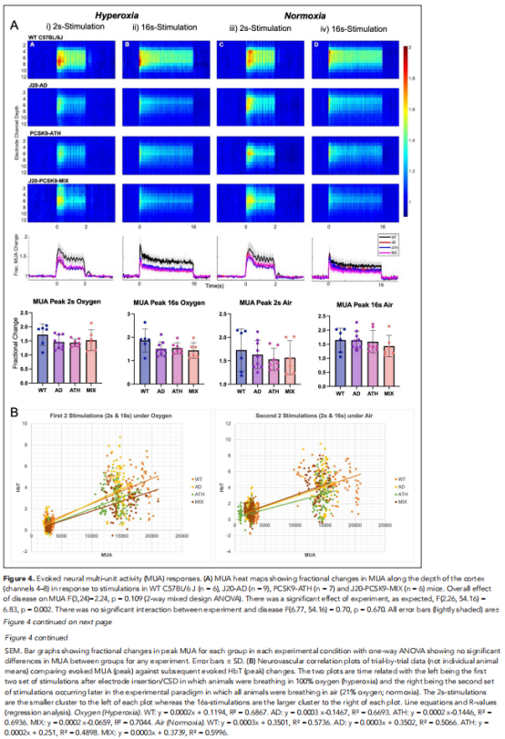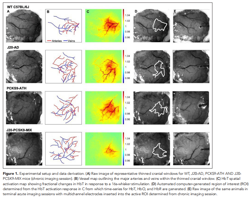 本研究通过利用一种新的动脉粥样硬化模型进行研究。实验结果显示,二维光学成像光谱(2D-OIS)通过变薄的颅窗测量大脑皮质血流动力学(见图一)。PCSK9-ATH小鼠大脑中的慢性血流动力学反应降低(见图二)。CSD在患病动物中更严重,并影响血流动力学恢复至基线(见图三)。与WT小鼠相比,任何疾病组的刺激诱发的神经活动都没有显着改变(见图四)。J20-PCSK9-MIX小鼠的海马Aβ斑块数量增加。J20-AD和PCSK9-ATH小鼠的神经炎症增加(见图五)。