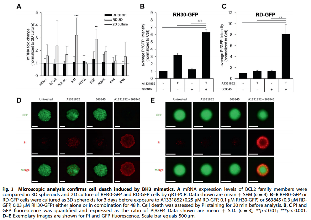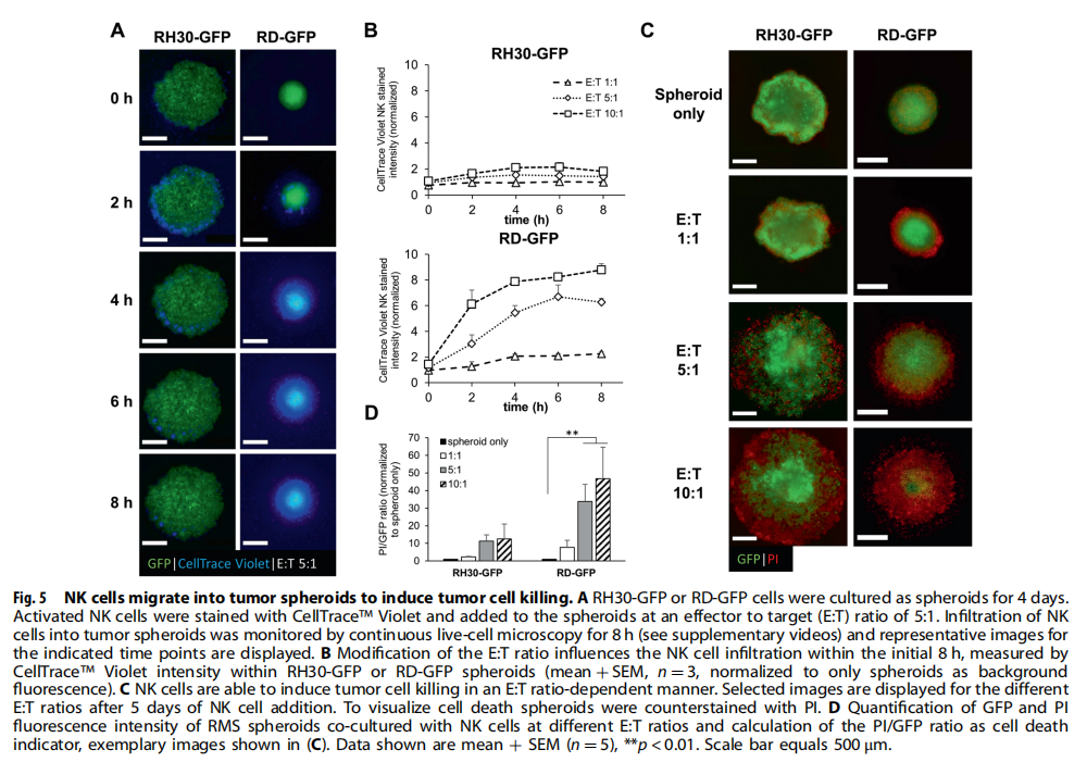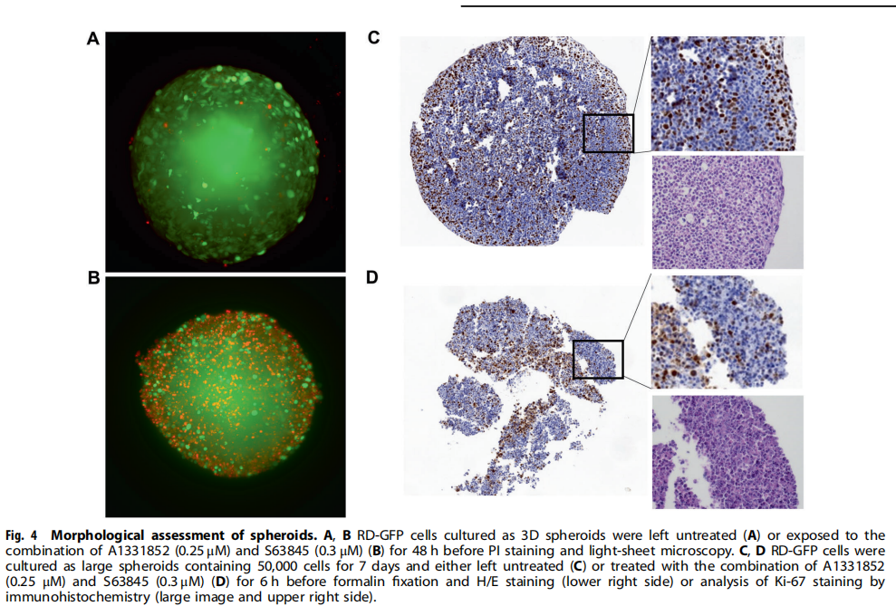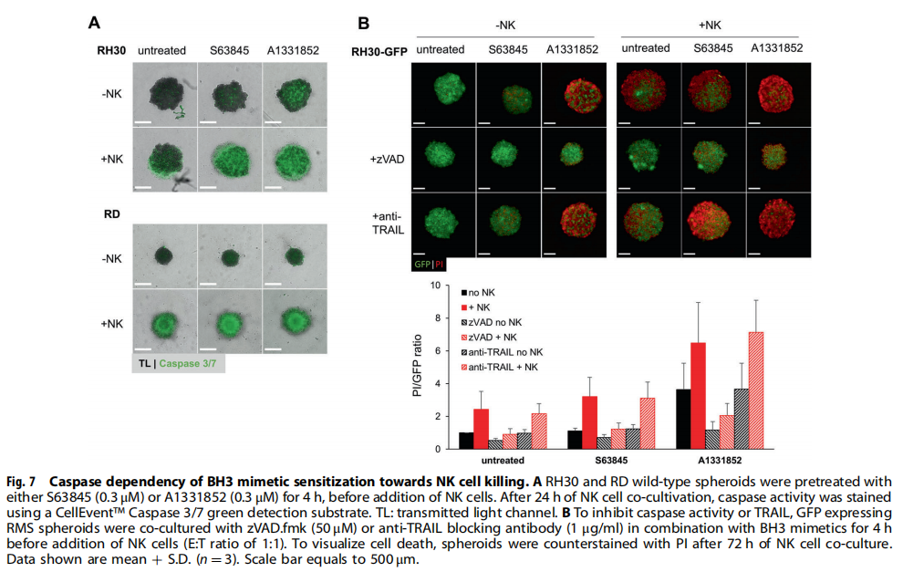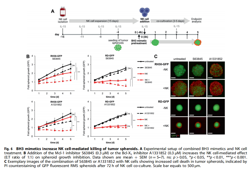 本研究利用类器官技术为小儿癌症建立3D球体(见图一)。研究结果显示,BH3模拟物有效杀死肿瘤球体(见图二、图三、图四)。为了探索基于细胞系的球体是否可以作为药物测试平台,我们研究了对诱导凋亡的BH3模拟物的反应。实验结果进一步显示,肿瘤球体受到NK细胞的攻击(见图五);BH3模拟物和NK细胞的组合增加了对肿瘤细胞的杀伤力(见图六、图七)。