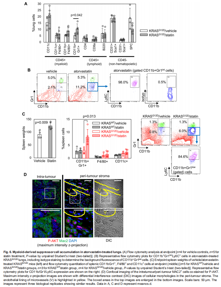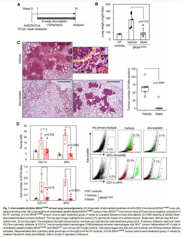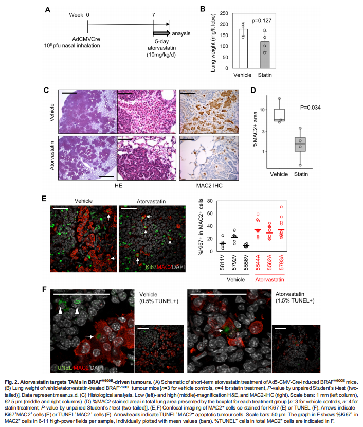 总体而言,本文的数据证实了他汀类药物在肺腺癌早期对TAM谱系细胞的疗效,但要注意不要长期使用它们。我们的数据还表明,其他TAM靶向疗法的临床开发可能会受到类似耐药性问题的阻碍。因此,需要全面了解基质驱动的耐药性和TAM异质性的机制基础,以便制定更好的策略来有效靶向肺腺癌中的TAM。由于本研究中的BRAFV600E和KRASG12D模型都没有特别的免疫原性,因此研究阿托伐他汀在免疫原性和进行性肺腺癌模型中的影响也将很有趣。