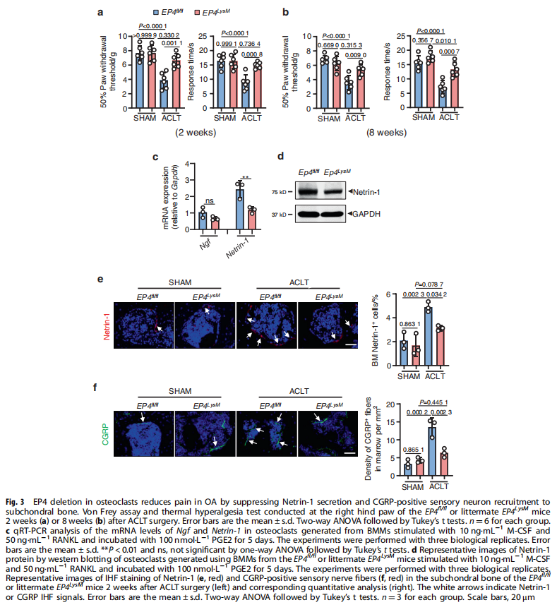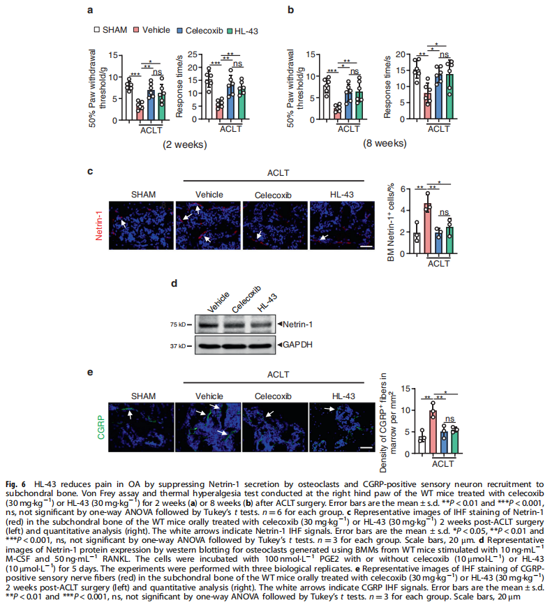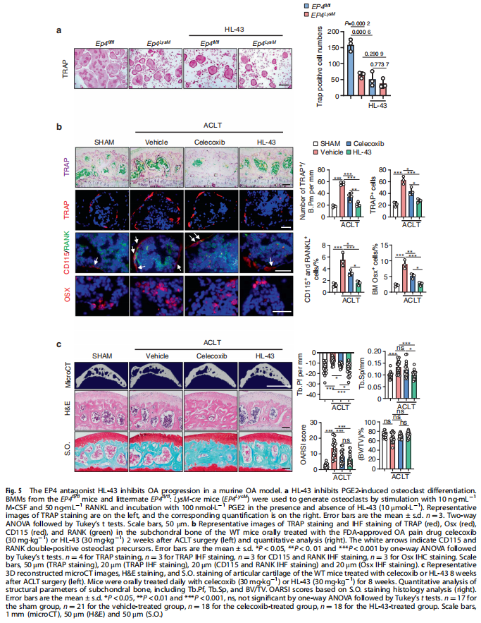 总之,本文的研究确定了PGE2作用于软骨下骨破骨细胞介导OA发病机制的新机制。我们提供的证据表明PGE2对破骨细胞的这些作用是通过EP4受体发生的。此外,靶向破骨细胞中的PGE2/EP4可显着减弱软骨下骨血管生成和感觉神经元神经支配,从而降低疼痛敏感性。最后,作者还确定HL-43是一种有效的EP4拮抗剂,它与EP4缺失相似,可减少OA进展、骨赘形成和疼痛敏感性,并改善软骨下骨微结构,因此是OA治疗的新候选者。