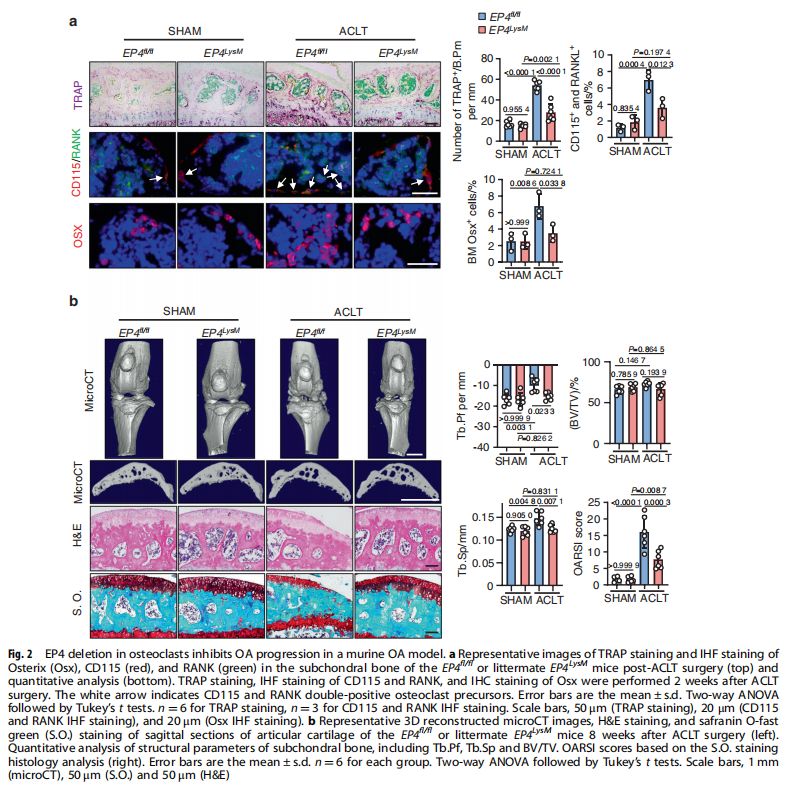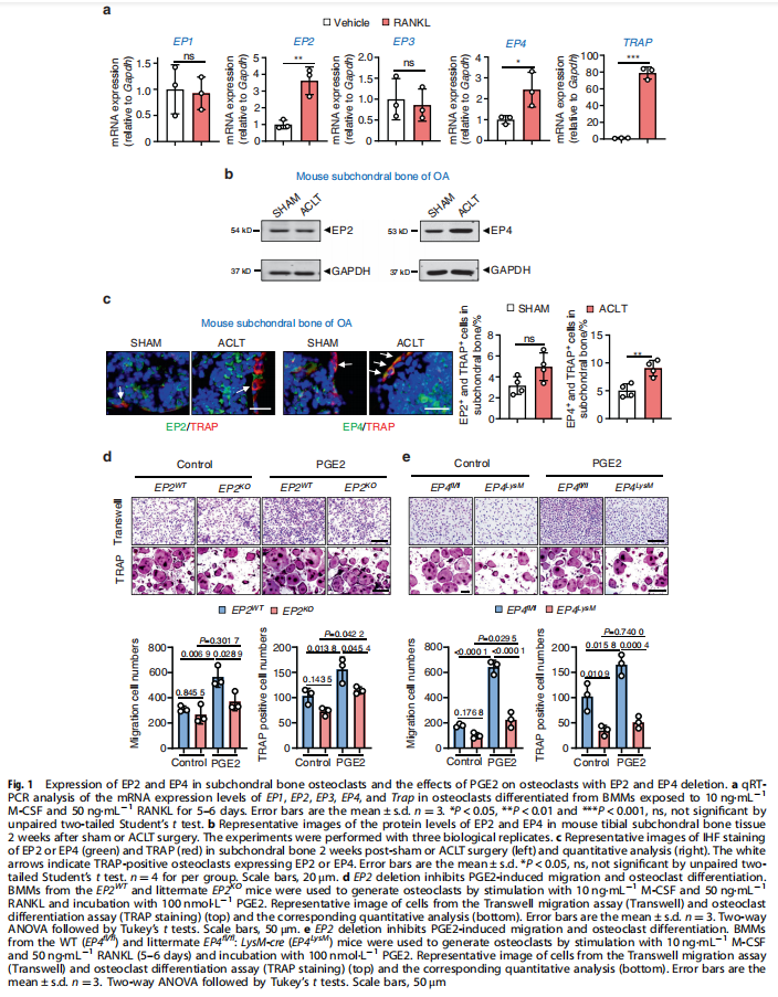 PGE2通过四种E前列腺素(EP)视紫红质样G蛋白偶联受体(EP1-4)46发挥其复杂的生物学效应。EP2和EP4在骨骼系统中高度表达,尤其是EP4起着重要的调节作用。EP4敲除小鼠缺乏PGE2诱导的骨形成,这归因于成骨细胞分化减少。此外,EP4激动剂可减少去卵巢大鼠的骨质流失。在OA中,PGE2/EP4信号轴的作用仍然存在争议,研究报告了对蛋白多糖合成和基质降解的矛盾影响。此外,PGE2在OA中调节软骨下骨稳态,特别是破骨细胞功能的确切机制仍然很大程度上未知。