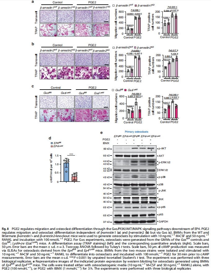 本文研究了PGE2如何通过破骨细胞中的EP4受体而不是EP2受体发挥作用。实验结果显示:来自骨关节炎的软骨下骨的破骨细胞中EP4而非EP2的表达升高(见图一);PGE2通过EP2和EP4调节迁移和破骨细胞分化(见图一);EP4缺失,但不是EP2缺失,抑制OA小鼠模型中的OA进展(见图二);破骨细胞中的EP4敲除通过抑制Netrin-1分泌和将CGRP阳性感觉神经元募集到软骨下骨来减轻OA的疼痛(见图三);破骨细胞中的EP4敲除通过抑制PDGF-BB分泌来减少软骨下骨中的H型血管(见图四)。研究结果进一步显示,鉴定一种用于PGE2诱导的迁移和破骨细胞分化的新型强效EP4拮抗剂(见图五);HL-43是一种EP4拮抗剂,可抑制OA小鼠模型中的OA进展(见图五);HL-43通过抑制Netrin-1分泌并将CGRP阳性感觉神经元募集到软骨下骨来减轻OA疼痛(见图六);HL-43通过抑制破骨细胞分泌PDGF-BB来减少软骨下骨中的H型血管与载体治疗组相比(见图七);PGE2/EP4信号轴通过Gαs/PI3K/AKT/MAPK激活调节迁移和破骨细胞分化(见图八)。
