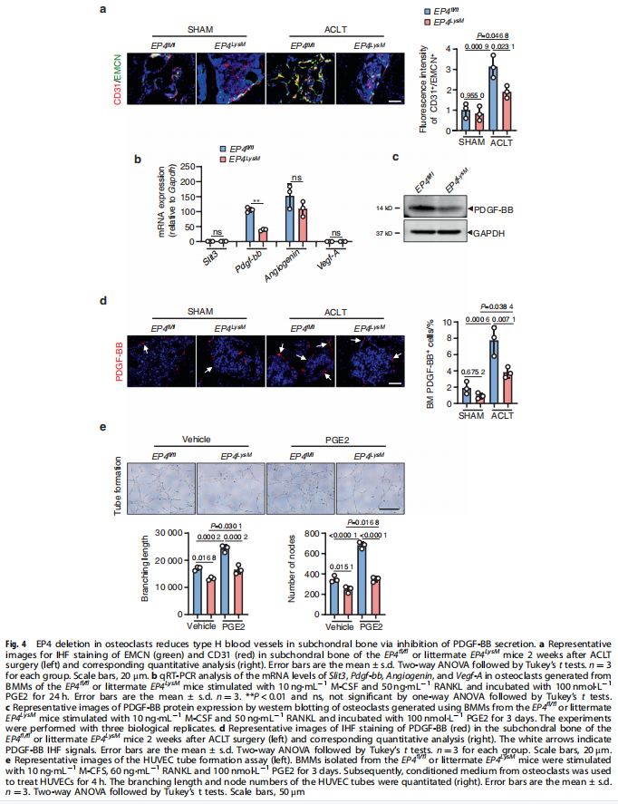 前列腺素E2(PGE2)是一种主要的环氧合酶-2(COX-2)产物,由骨关节炎(OA)患者的软骨下骨组织中的成骨细胞谱系高度分泌。然而,非甾体抗炎药,包括COX-2抑制剂,在OA治疗期间具有严重的副作用。因此,迫切需要鉴定OA进展中PGE2信号传导的新药物靶点。破骨细胞在软骨下骨稳态和OA相关疼痛中起关键作用。然而,PGE2调节破骨细胞功能和随后的软骨下骨稳态的机制在很大程度上是未知的。在这里,本文显示PGE2在OA和OA相关疼痛的进展过程中通过破骨细胞上的EP4受体起作用。本文的数据表明,虽然PGE2通过其EP2和EP4受体介导迁移和破骨细胞生成,EP4LysM减少了OA小鼠模型中的疾病进展和骨赘形成。此外,与OA相关的疼痛在EP4LysM小鼠中得到缓解,Netrin-1分泌减少和软骨下骨的CGRP阳性感觉神经支配。EP4LysM小鼠中血小板衍生生长因子-BB(PDGF-BB)的表达也较低,这导致软骨下骨中H型血管的形成减少。重要的是,本文发现了一种新型强效EP4拮抗剂HL-43,其在体外和体内的作用与在EP4LysM中观察到的一致。最后,作者发现Gαs/PI3K/AKT/MAPK信号通路是破骨细胞中通过PGE2激活EP4的下游。总之,本文的数据表明破骨细胞中的PGE2/EP4信号传导介导软骨下骨中的血管生成和感觉神经元神经支配,促进OA进展和疼痛,并且用HL-43抑制EP4在OA中具有治疗潜力。
