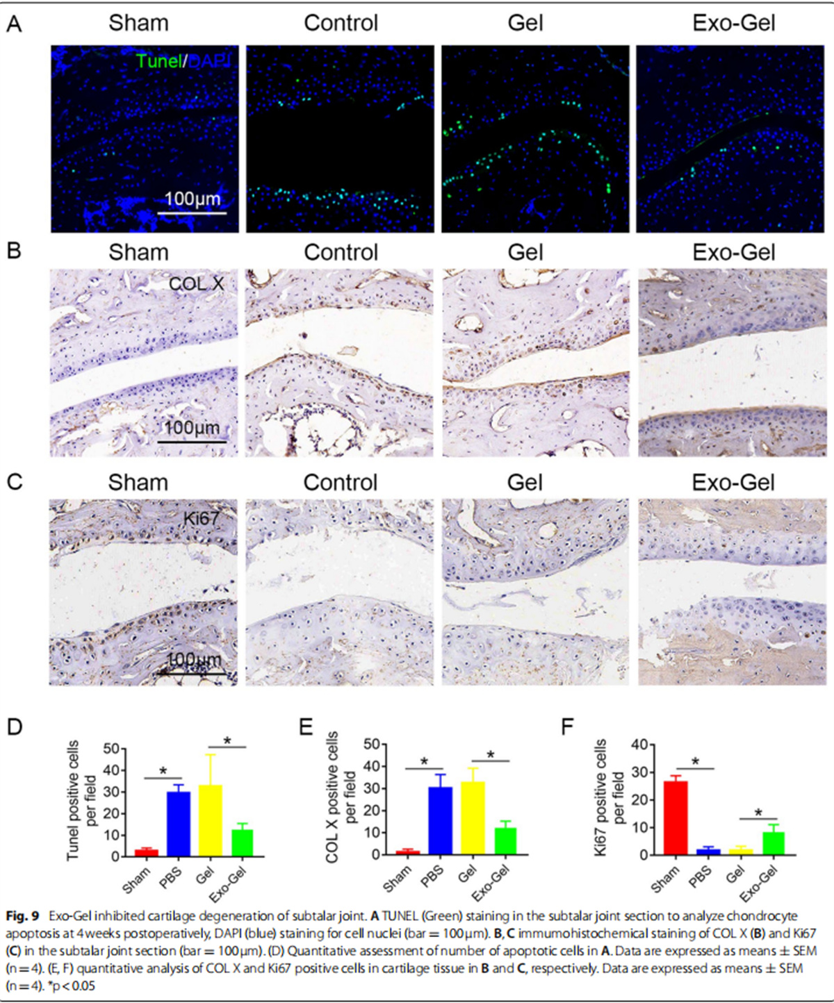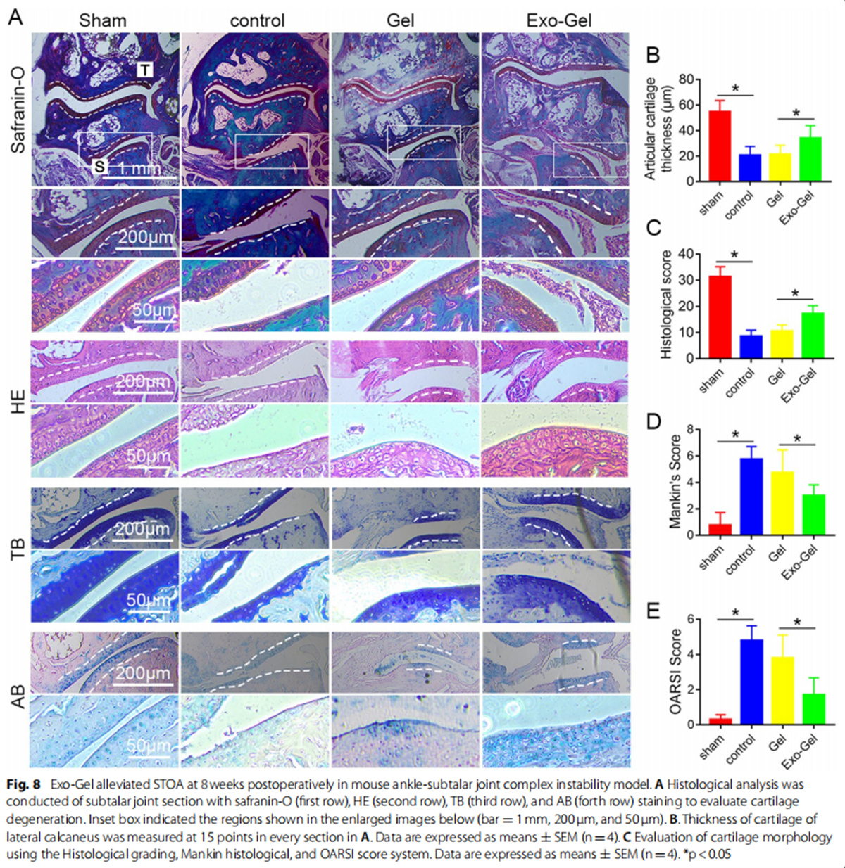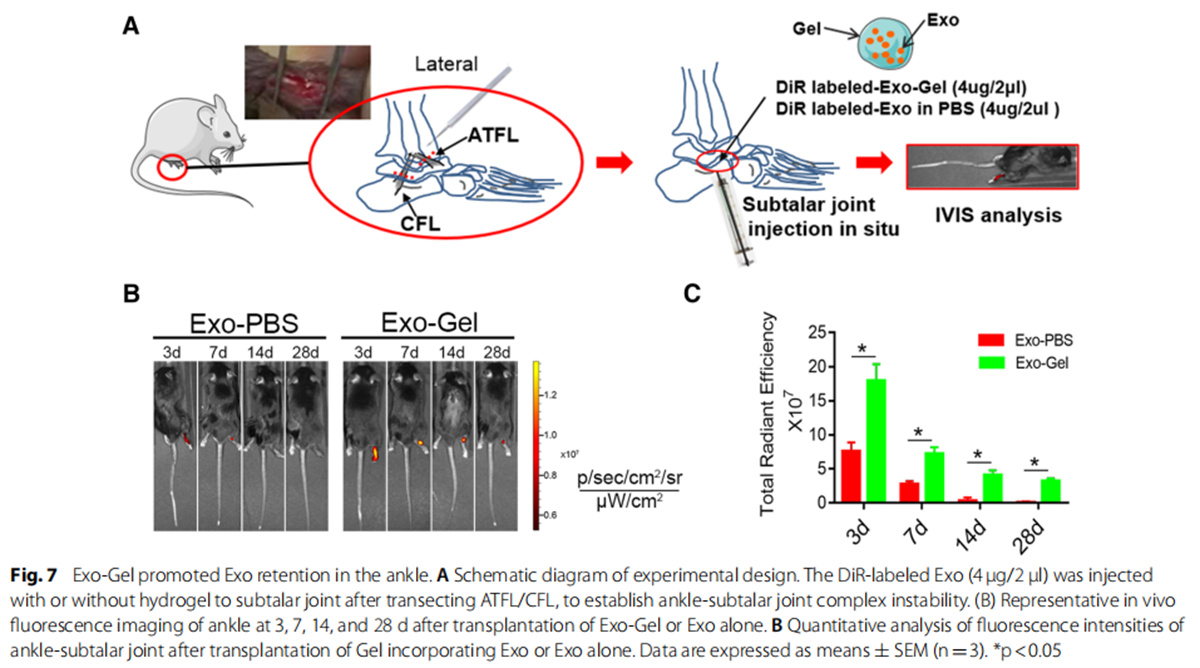 在这里,作者研究了使用带有泊洛沙姆的热敏凝胶作为PRP-Exo递送的平台,旨在延长Exo向靶器官的局部递送。本研究中,PRP-Exo掺入凝胶(Exo-Gel)延长了具有生物活性的Exo的释放,促进了小鼠骨间充质干细胞(mBMSCs)和软骨细胞的增殖和迁移,增强了mBMSCs的成软骨分化,保护软骨细胞在体外抑制炎症诱导的细胞凋亡和变性。在横切ATFL/CFL后的踝关节外侧不稳定小鼠模型中,与单独使用Exo相比,Exo-Gel增加了外泌体在踝部的保留,因此可能通过内源性mBMSCs归巢诱导损伤部位来提高STOA的治疗效果,诱导软骨分化,