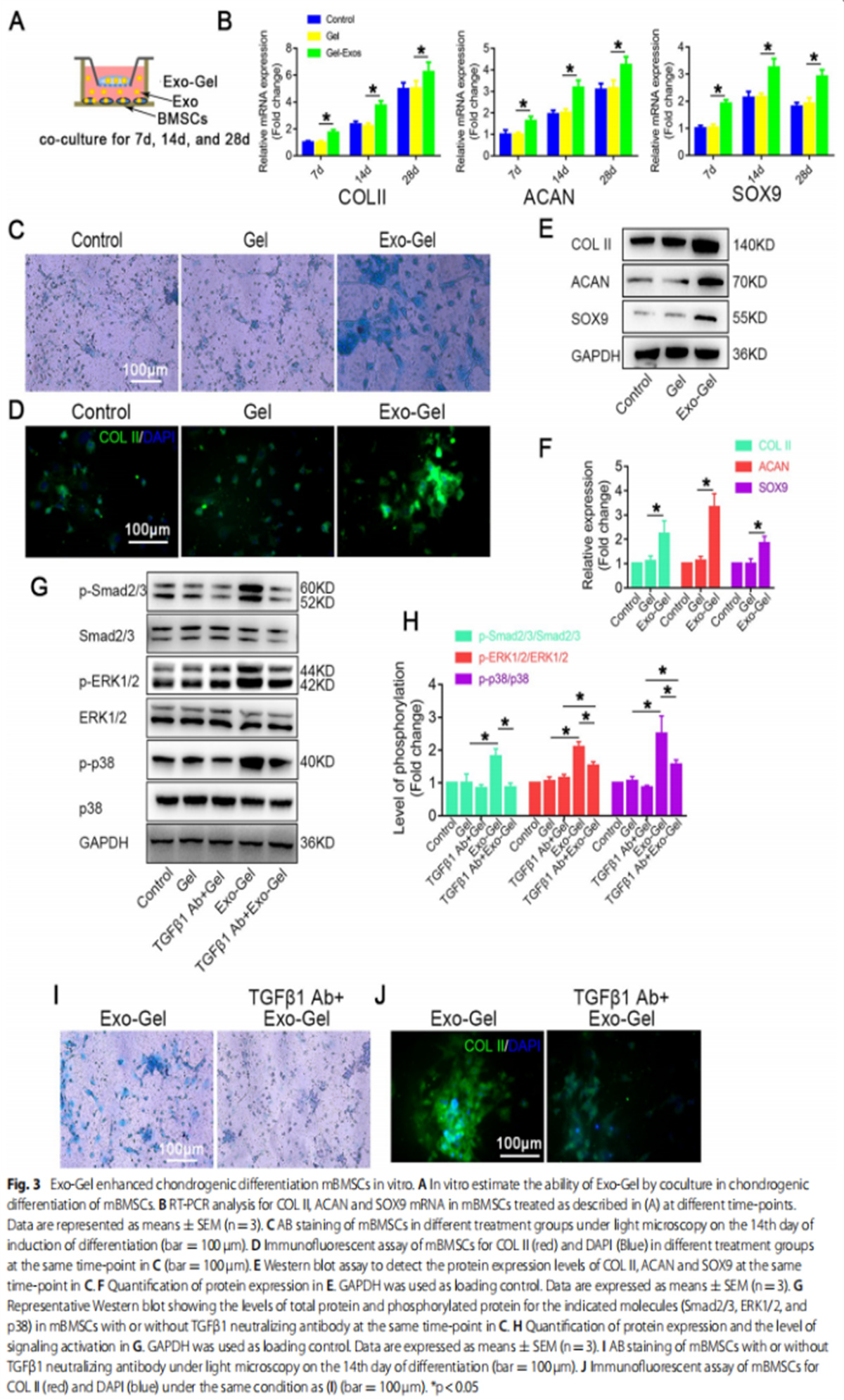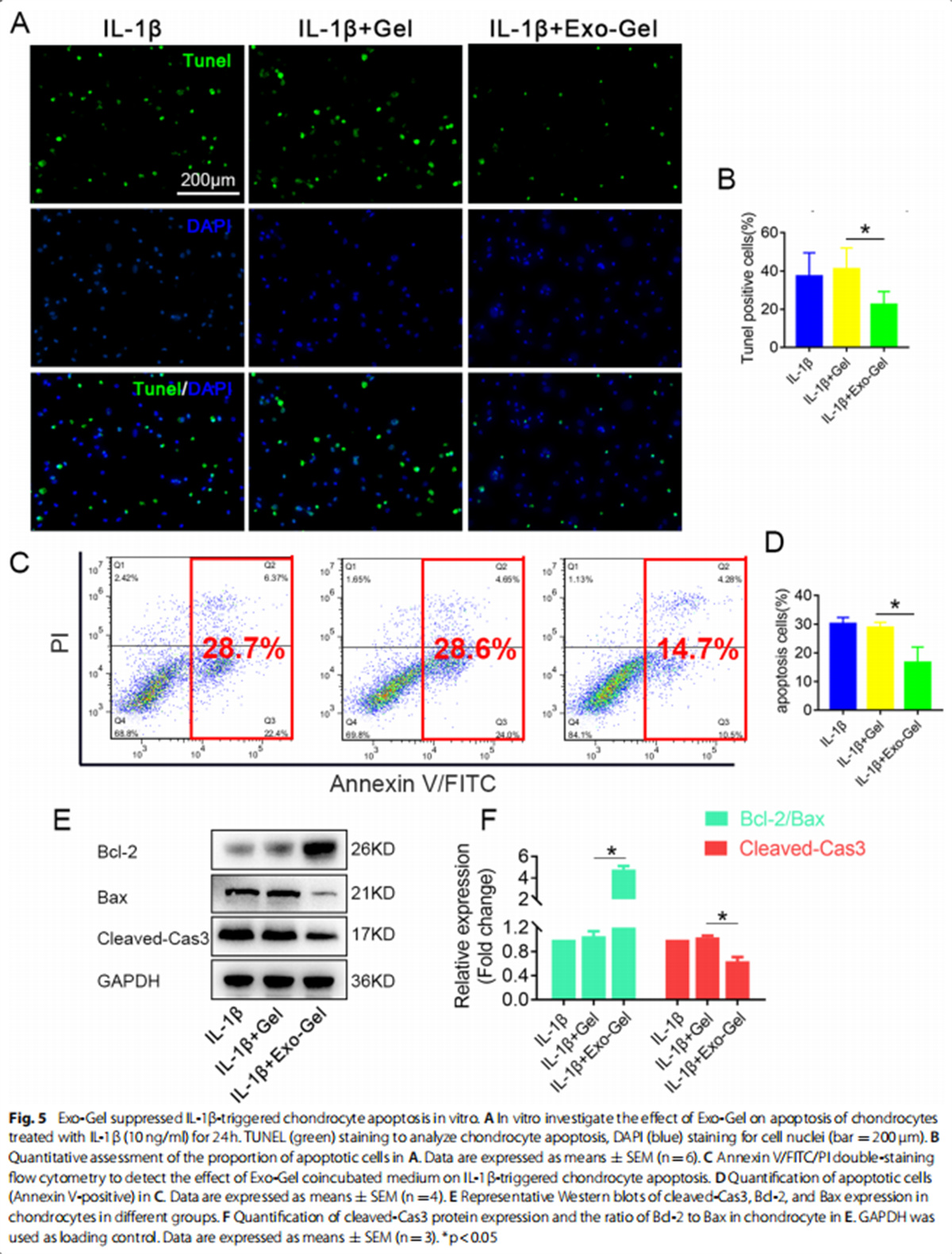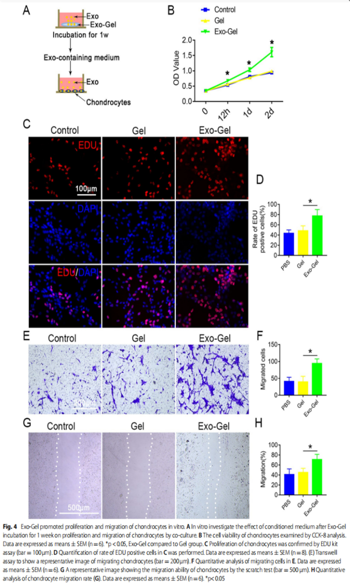 在这里,作者研究了使用带有泊洛沙姆的热敏凝胶作为PRP-Exo递送的平台,旨在延长Exo向靶器官的局部递送。本研究中,PRP-Exo掺入凝胶(Exo-Gel)延长了具有生物活性的Exo的释放,促进了小鼠骨间充质干细胞(mBMSCs)和软骨细胞的增殖和迁移,增强了mBMSCs的成软骨分化,保护软骨细胞在体外抑制炎症诱导的细胞凋亡和变性。在横切ATFL/CFL后的踝关节外侧不稳定小鼠模型中,与单独使用Exo相比,Exo-Gel增加了外泌体在踝部的保留,因此可能通过内源性mBMSCs归巢诱导损伤部位来提高STOA的治疗效果,诱导软骨分化,