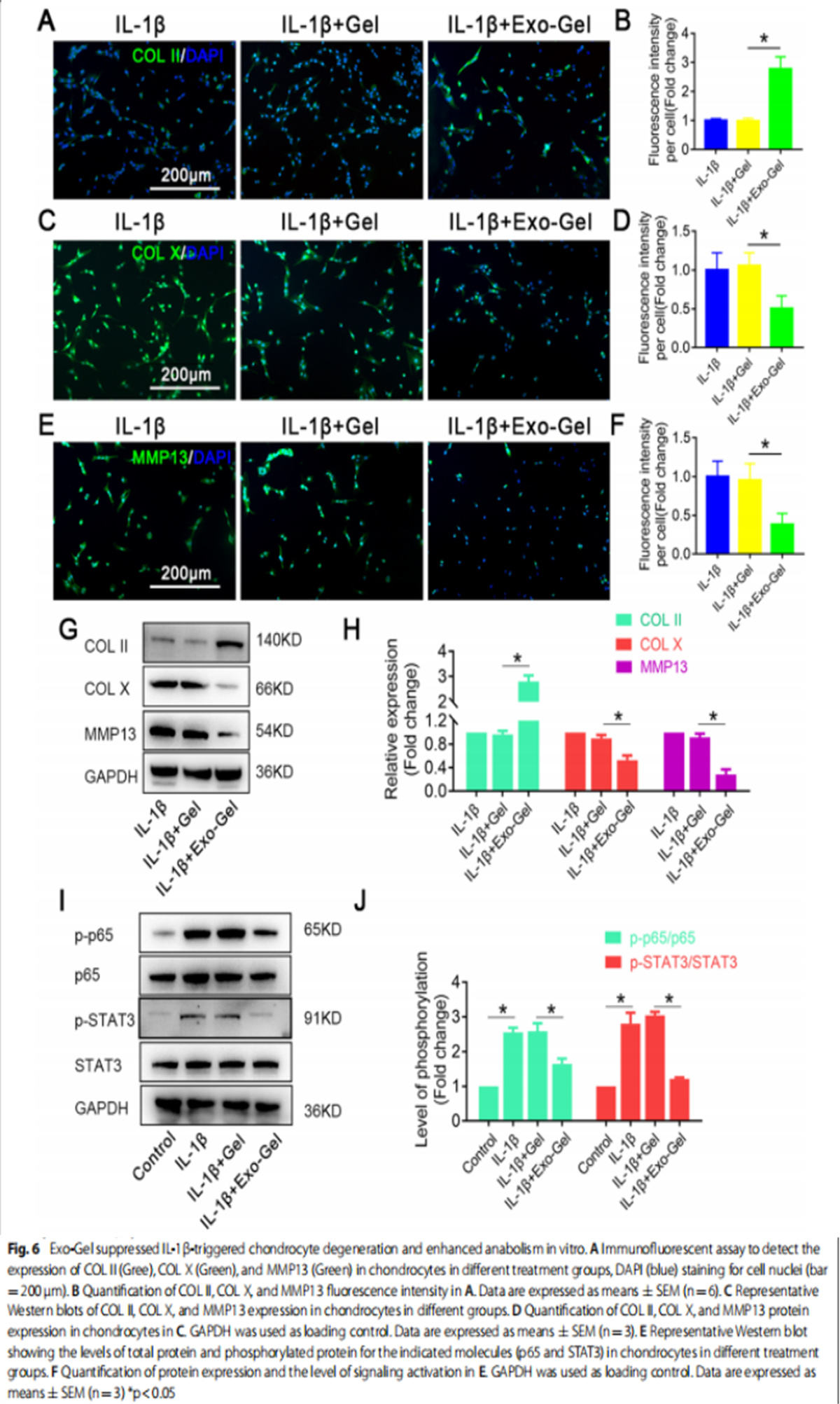 在这项研究中,PRP衍生的Exo被纳入热敏凝胶中作为持续递送系统。我们的研究表明,PRP-Exo对mBMSCs功能具有正向调节作用,并对IL-1β诱导的体内软骨细胞凋亡和退化起到保护作用。与仅注射Exo相比,该系统的应用允许将Exo保留在脚踝中,从而保持Exo的局部浓度。总之,Exo-Gel对抑制软骨退化和STOA的发展具有有效作用。