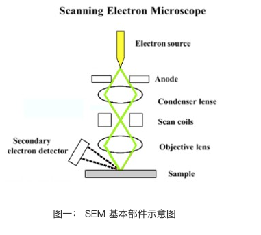 会聚镜,电子通往样品时首先遇到的透镜。会聚镜会在电子束锥角张开之前将电子束会聚,电子在轰击样品之前会再由物镜会聚一次。会聚镜决定了电子束的尺寸(决定着分辨率),物镜则主要负责将电子束聚焦到样品上。扫描电镜的光路系统同样还包含了用于将电子束在样品表面光栅化的扫描线圈。在许多时候,孔径光阑会结合透镜一起控制电子束大小。这些 SEM 的主要部件如图1 所示。
