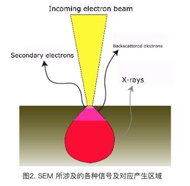 电子与样品的相互作用会产生不同种类的电子、光子或辐射。对于扫描电镜 SEM 来说,用于成像的两类电子分别是背散射电子 (BSE) 和二次电子 (SE)。背散射电子来自于入射电子束,这些电子与样品发生弹性碰撞,其中一部分反弹回来,这就是背散射电子。另一方面,二次电子则来自于样品原子:它们是入射电子与样品发生非弹性碰撞所产生的。