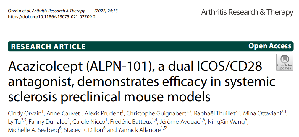 作者:超级管理员时间:2022-03-24背景不受控制的T细胞激活免疫反应在系统性硬化症(SSc)的发病机制中起关键作用,这种疾病的特点是全身性纤维化,特别是影响肺和皮肤。共刺激分子是免疫激活过程中的关键分子,最近的证据支持CD28和ICOS在纤维化发展中的作用。我们在此研究了双重ICOS/CD28拮抗剂acazicolcept (ALPN-101)在两个互补的SSc相关小鼠模型中的功效,