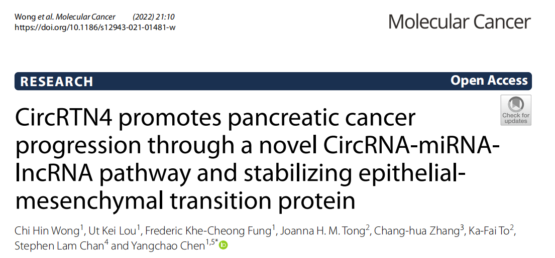 作者:超级管理员时间:2022-03-27背景环状RNA(circRNA)在许多生物过程中发挥着重要作用。然而,circRNA在癌症中的关键作用的详细机制在很大程度上仍未被探索。我们旨在探索circRTN4在胰腺导管腺癌(PDAC)中发挥关键作用的分子机制。(图一)方法与结果在PDAC原发性肿瘤中检测了CircRTN4表达水平。在小鼠肿瘤模型中研究了circRTN4在PDAC肿瘤生长和转移中