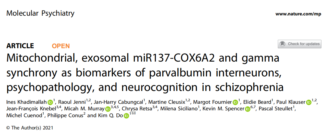 作者:超级管理员时间:2022-01-05摘要:精神分裂症的早期检测和干预需要基于机制的生物标志物来捕获神经回路功能障碍,允许更好的患者分层、监测疾病进展和治疗。在氧化还原异常小鼠(Gclm-KO±GBR)的前额叶皮质和血液中,氧化应激诱导miR-137上调,导致COX6A2和线粒体吞噬标志物(NIX、Fundc1和LC3B)降低,受损线粒体积累,进一步加剧氧化应激和小白蛋白中间