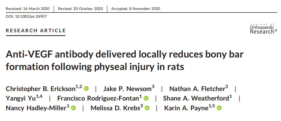 作者:超级管理员时间:2022-01-17摘要:骨骺损伤可导致“骨棒”的形成,从而导致儿童骨生长停滞和畸形。血管内皮生长因子(VEGF)已被证明在骨条形成中发挥作用,使其成为骨骺损伤后抑制骨修复组织的潜在靶点。本研究的目的是研究从海藻酸盐:壳聚糖水凝胶局部传递抗VEGF抗体(αVEGF;7.5μg)到大鼠胫骨骨骺损伤部位是否能阻止骨棒的形成。我们分别使用90:10和