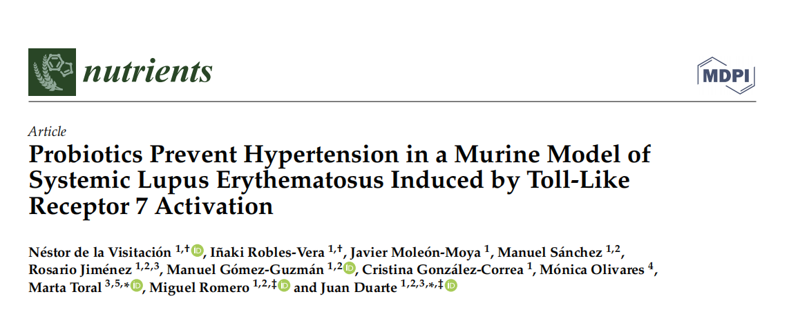 作者:超级管理员时间:2021-12-27摘要:本研究在药物诱导的系统性红斑狼疮(SLE)模型中测试了发酵乳杆菌CECT5716(LC40)和/或短双歧杆菌CECT7263(BFM)预防肠道生态失调、高血压和内皮功能障碍的作用。作者用不含(Ctrl)或TLR-7咪喹莫特激动剂(IMQ)治疗8周大的BALB/cByJRj小鼠8周。同时给予LC40(109CFU/mL)和BFM(109CFU/mL),每天灌胃一次。IMQ诱