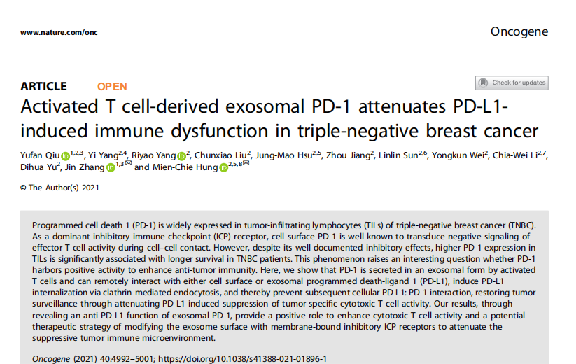 作者:超级管理员时间:2022-01-02摘要程序性细胞死亡1(PD-1)在三阴性乳腺癌(TNBC)的肿瘤浸润淋巴细胞(TIL)中广泛表达。作为主要的抑制性免疫检查点(ICP)受体,众所周知,细胞表面PD-1在细胞-细胞接触期间转导效应T细胞活性的负信号。然而,尽管有充分证明的抑制作用,但TIL中较高的PD-1表达与TNBC患者的更长生存期显着相关。这种现象提出了一个有趣
